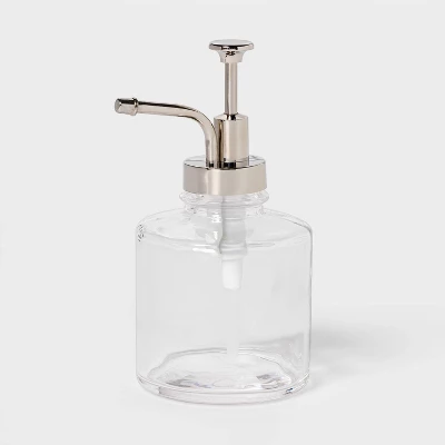 Bring a new look to your bathroom counters with the Oil Can Collection Lotion Bottle/Tumbler/Soap Dish set from Threshold™. This bathroom counter set includes an oil can-style soap bottle, tumbler and soap dish so you have everything you need for a functional bathroom. Each piece is made from glass for an authentic look and feel, with silver metal components accenting the clean look of the glass so you can bring elegant appeal to your space. Simply fill the soap pump with your favorite scented soap and keep your toothbrush in the tumbler for convenience.