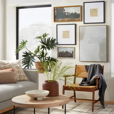 Liven up your living spaces with this Set of 2 Vases Framed Under Glass from Threshold™ designed with Studio McGee. This set of 2 framed pieces of wall art under glass can be hung on an empty patch of wall to enhance the space and soften the room. Each piece features a line sketch of a vase on tan paper contained in a black wood composite frame for a minimalist style that will fit most decor styles neatly, and the glass front helps protect the art from dust and damage.