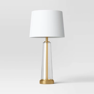 Bring modern elegance to your indoor lighting with this Tapered Fillable Table Lamp from Threshold™. This accent table lamp features a conical clear glass base that’s fitted on a gold-tone metal base for added flair. The white drum shade finishes off the clean, chic look and gives your space a soft glow, while the on/off light setting with a rotary-socket switch allows for easy use. Place it on any side table, console or sideboard for stylish and practical lighting.
